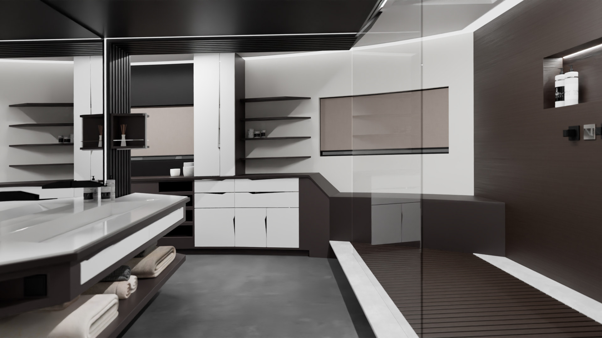 Projet fictif, entièrement réalisé, de la création des plans de la suite jusqu'aux rendus finaux 3D.
